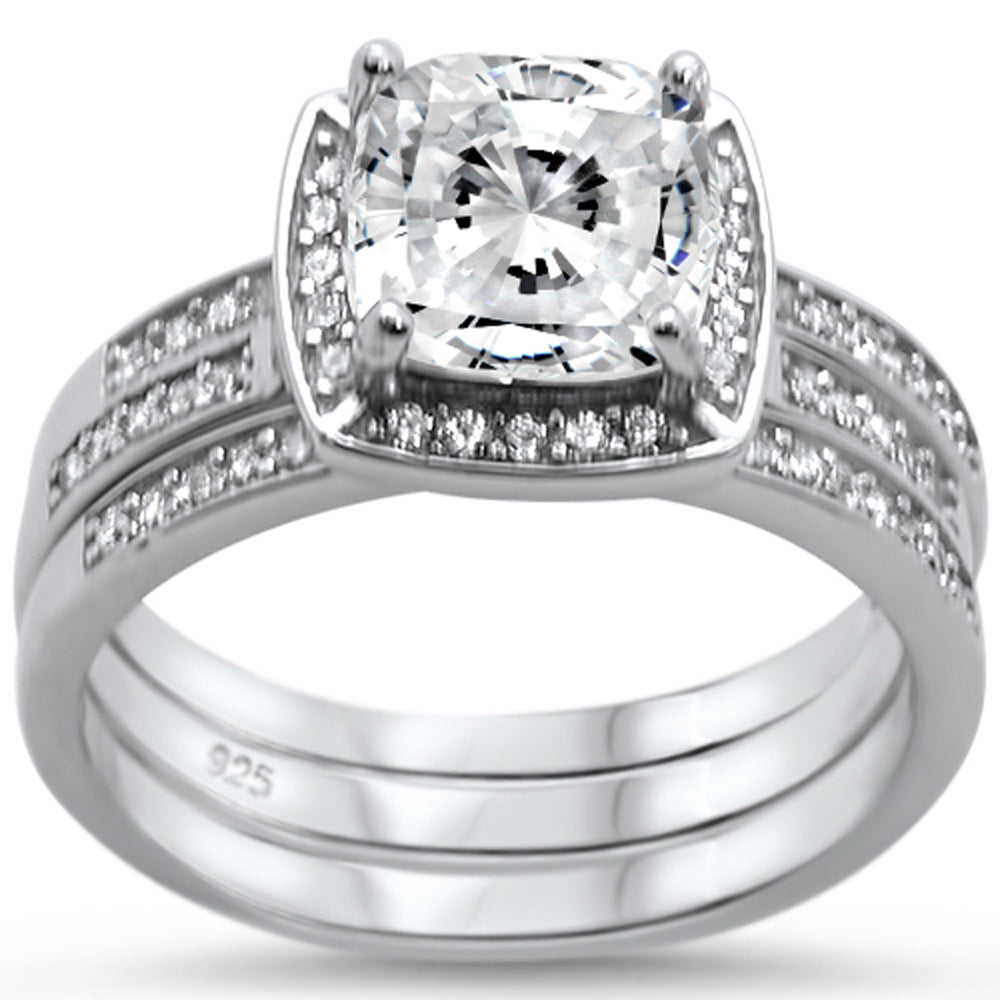 Cushion Cut Three Piece Engagement .925 Sterling Silver Ring Set Sizes 6-8