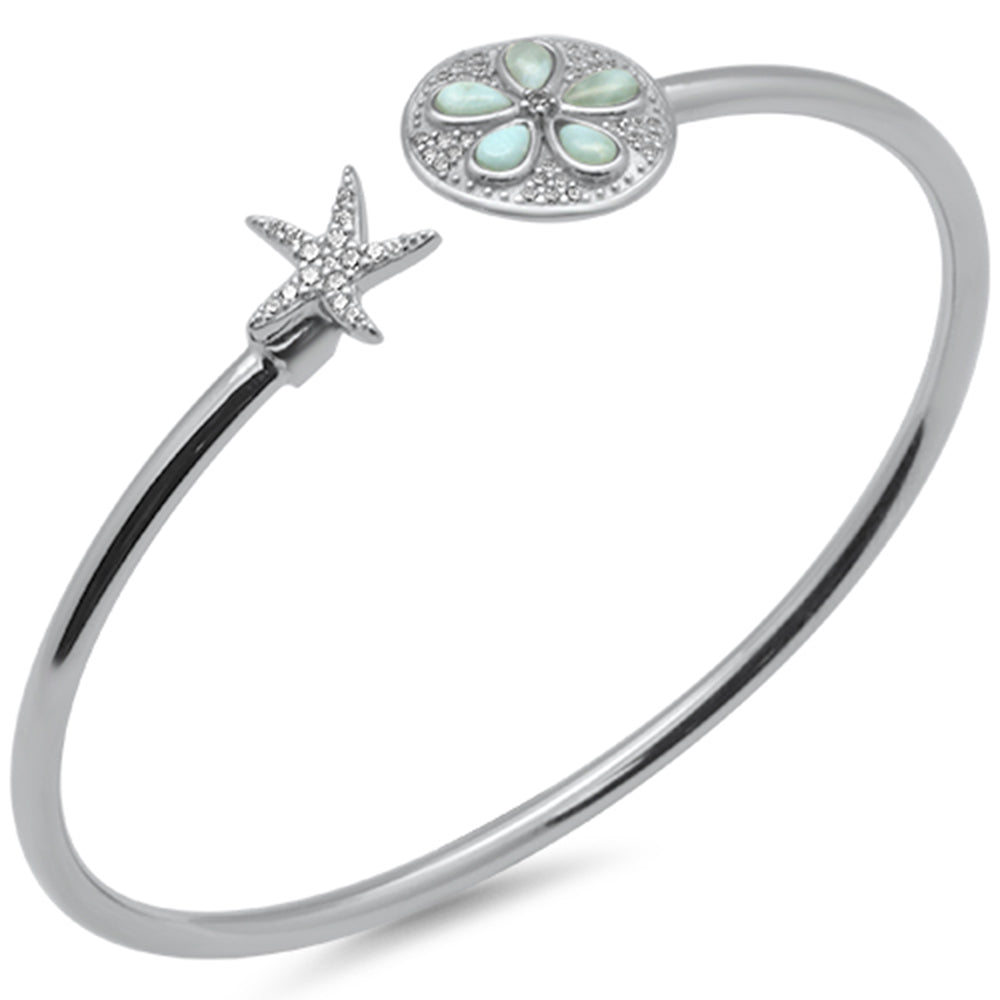 Starfish & Sand Dollar Plumeria Natural Larimar & CZ .925 Sterling Silver Cuff Bracelet